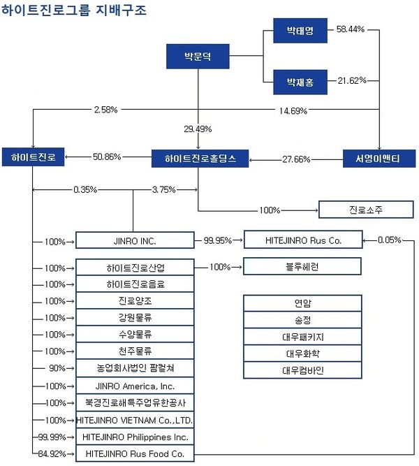 여기에 하이트진로홀딩스는 하이트진로 지분 50.86%, 진로소주 지분 100%를 각각 보유하고 있다. 하이트진로는 하이트진로산업, 하이트진로음료 등 13개 계열사의 지분을 80% 이상 보유한다.