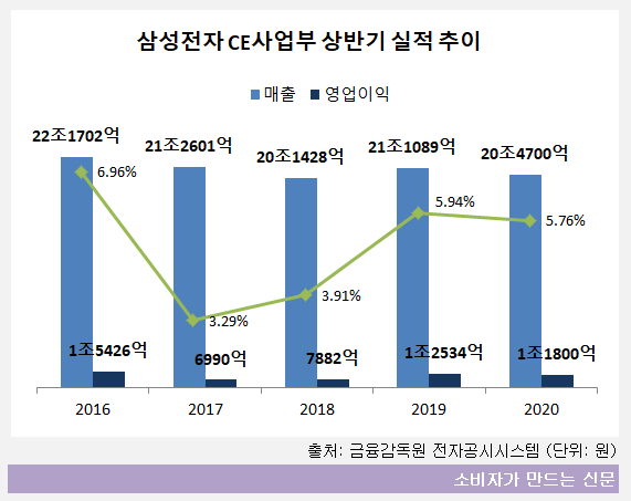 삼성전자 CE부문은 상반기 매출 20조4700억 원, 영업이익 1조1800억 원으로 집계됐다. 전년 동기에 비해 매출은 3%, 영업이익은 5.9% 감소했다.