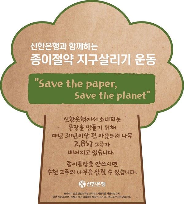 신한은행 관계자는 “매년 종이 통장 제작을 위해 30년산 아름드리나무 2857그루가 소모되는 것으로 추정된다”며 “고객과 직원이 함께 실천할 수 있는 캠페인 활동을 지속해 신한은행이 환경 보호 운동에 적극 동참하겠다”라고 밝혔다.
