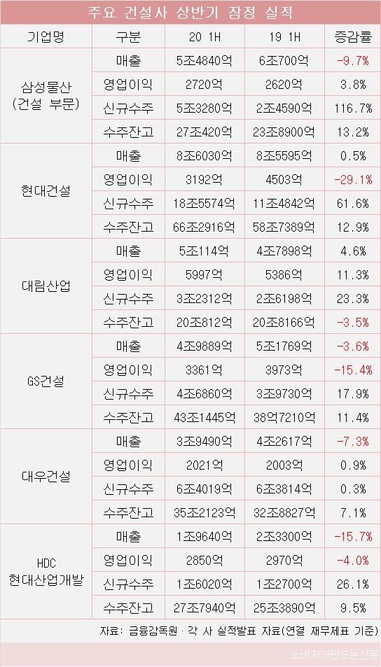 상반기 가장 호실적을 올린 대림산업은 건설사업부 실적 호조와 카리플렉스(Cariflex) · 고려개발 인수합병 등으로 매출과 영업이익이 함께 증가했다. 영업익은 2분기에만 3103억 원(별도 2279억 원)을 기록했으며 누적 기준 5997억 원을 올렸다. 매출은 5조114억 원으로 4.6% 증가했고 신규수주도 23.3% 증가했다.