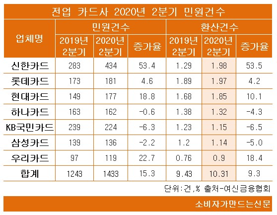 6일 여신금융협회에 따르면 올해 2분기 전업 카드사 7곳의 민원건수는 총 1433건으로 전년 동기 1243건 대비 15.3% 급증했다. 카드발급 10만 건 당 민원건수를 의미하는 환산건수도 10.31건으로 전년 동기 9.43건 대비 9.3% 늘었다.