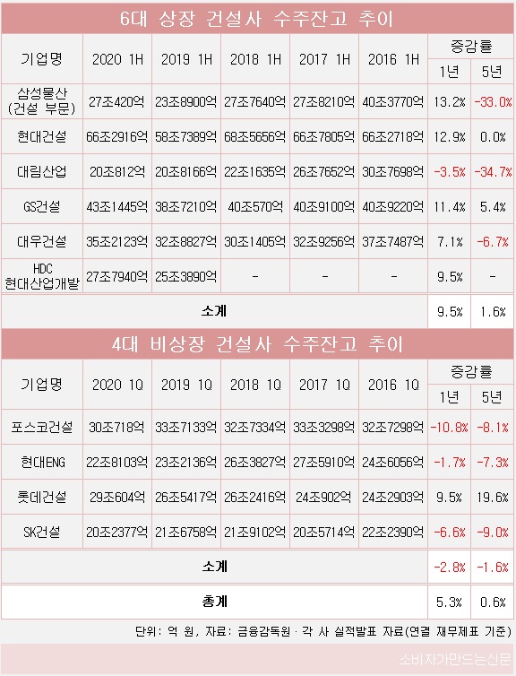 6일 금융감독원 전자공시시스템에 따르면 국내 시공능력평가 상위 10대 건설사 중 상장 건설사 6곳의 수주잔고는 올 상반기 기준 총 219조5656억 원으로 전년 대비 9.5% 늘었다. 반면 비상장사 4곳은 올 1분기 기준 102조1802억 원으로 2.8% 감소했다.