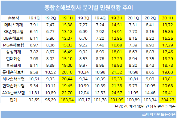 업체별로는 계약 10만 건 당 환산 민원건수 기준 악사손해보험이 상반기 26.41건으로 가장 많았다. 한화손해보험(20.68건), 하나손해보험(19.81건), 롯데손해보험(19.63건) 등 주로 대형사보다 중·소형 손보사들의 민원이 상대적으로 더 많았다.
