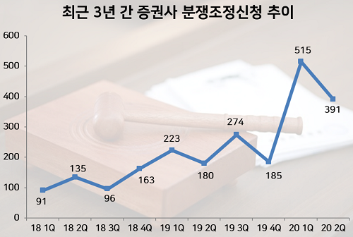 10일 금융투자협회에 따르면 올해 상반기 금융당국에 접수된 증권회사에 대한 분쟁조정 신청건(중복신청 제외)은 906건으로 작년 상반기 대비 124.8% 폭증했다. 지난해 전체 분쟁조정 신청건(862건)을 이미 초과한 상황이다. 분기별로도 지난 1분기 515건에 달했고 2분기에도 391건으로 평년 대비 2배 이상의 분쟁조정신청이 이뤄졌다.