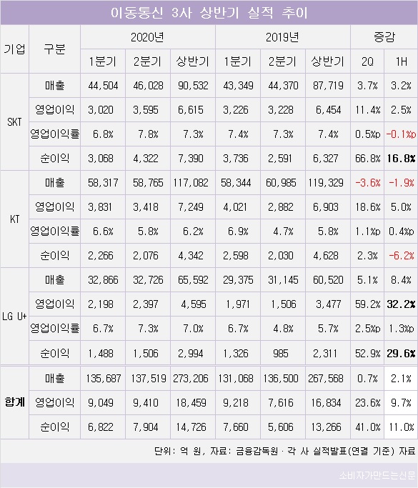 LG유플러스는 기저효과로 영업이익뿐 아니라 순이익도 가장 많이 증가했다. SKT는 SK하이닉스 지분 20.1%를 보유하므로 지분법이 적용돼 1분기는 17.9% 감소하고 2분기는 66.8% 늘었다.