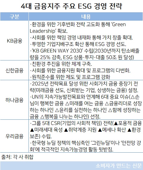 4대 금융지주는 ESG는 글로벌 시장에서 기업 가치를 높이고 이해관계자에게 신뢰받기 위한 기업경영의 필수 요소이며 최근 정부의 뉴딜정책과도 맞물려 있다고 평가했다.
