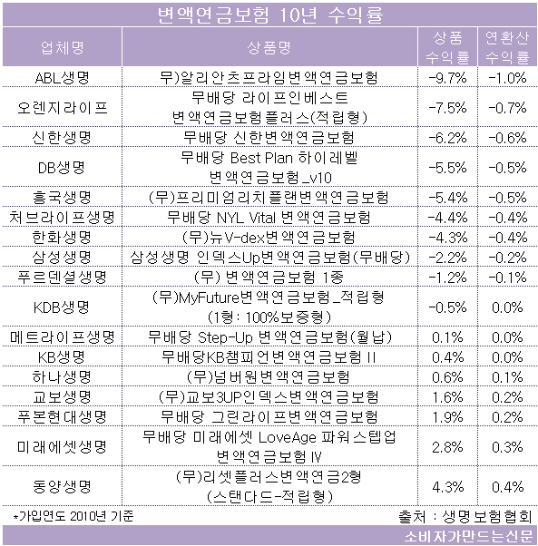 이어 DB생명 ‘Best Plan 하이레벨 변액연금보험’ –5.5%, 흥국생명 ‘프리미엄리치플랜변액연금보험’ -5.4%, 처브라이프생명 ‘무배당 NYL Vital 변액연금보험’ –4.4%, 한화생명 ‘뉴V-dex변액연금보험’ -4.3%, 삼성생명 ‘인덱스Up변액연금보험’ -2.2%, 푸르덴셜생명 ‘변액연금보험 1종’ -1.2%, KDB생명 ‘MyFuture변액연금보험 적립형’ -0.5% 등 17개 생보사 가운데 10곳이 마이너스 수익률을 기록했다.