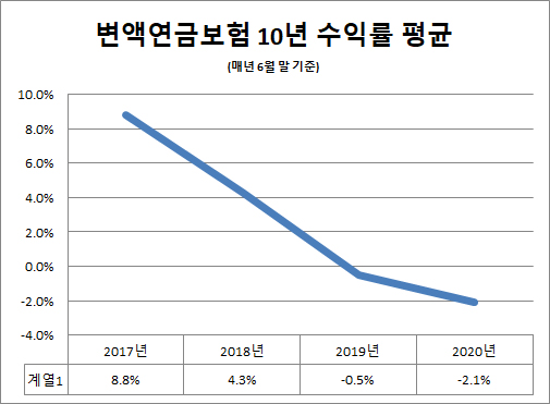 조사 기준은 변액연금보험 보증형으로, 중간에 해약할 경우 낸 보험료보다 해지환급금이 적고 유지 기간이 긴 만큼 10년 전인 2010년 가입했다고 가정하고 수익률을 계산했다.