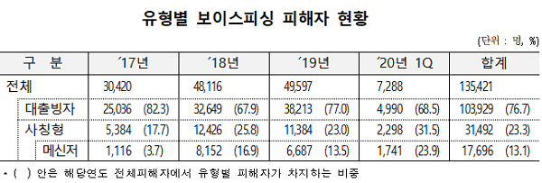 먼저 전체 피해자 13만5000여 명 중에서 대출빙자형 피해자는 10만4000여 명(76.7%)에 달했다. 사칭형 피해도 3만1000여 명으로 23.3%를 차지했다. 전체 피해에서 대출빙자형 피해 비중이 사칭형 피해보다 높은 추세를 지속 유지하고 있는 점은 특징이다.