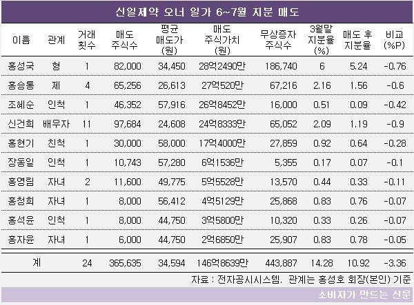 장내에서 매도한 주식 수는 신건희 씨가 9만7684주로 가장 많다. 홍 회장 형인 홍성국 씨, 동생 홍승통 씨 등도 6만 주 이상 매도했다.