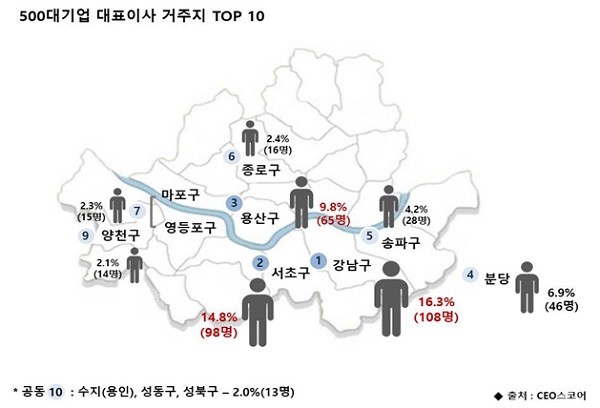 12일 기업평가사이트 CEO스코어(대표 박주근)가 지난 5일 기준 500대 기업 대표이사 664명(오너일가 111명, 전문경영인 553명)의 거주지역을 조사한 결과, △서울 460명(69.3%) △경기·인천 132명(19.9%) △기타 국내지역 65명(9.8%) △해외 7명(1.1%) 등으로 각각 집계됐다.