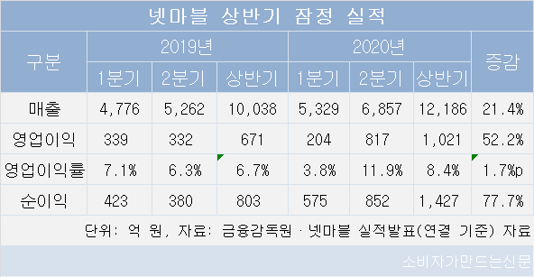 넷마블은 올 상반기 매출이 1조2186억 원으로 지난해 상반기보다 21.4% 증가했다고 12일 잠정 발표했다. 영업이익은 1021억 원으로 52.2% 늘었고 당기 순이익도 852억 원으로 77.7% 늘었다.