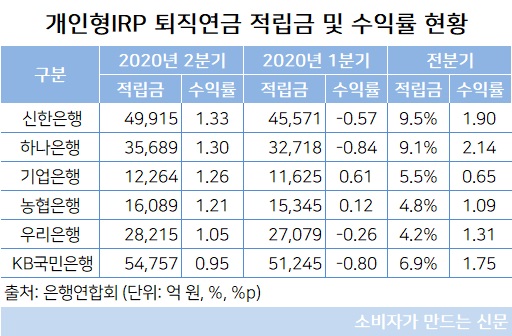 올 2분기 6대 은행의 퇴직연금 수익률이 일제히 상승한 것으로 나타났다. 특히 수익이 높은 고위험 상품 투자가 많았던 개인형IRP의 경우 가장 큰 폭의 상승폭을 보이며 플러스 수익률로 회복했다.