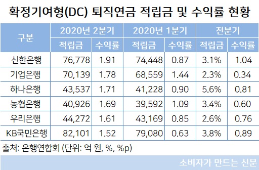 16일 은행연합회에 따르면 올해 2분기 6대 은행 퇴직연금 수익률이 1분기 대비 모두 상승했다.