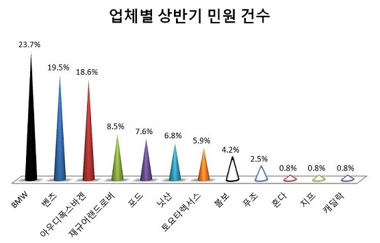 올 상반기 메르세데스-벤츠, BMW, 아우디폭스바겐, 볼보, 푸조, 닛산, 토요타(렉서스), 혼다, 재규어랜드로버, 지프, 포드, 캐딜락 등 국내 수입차 업체 12곳을 대상으로 소비자들이 가장 많은 불만을 제기한 문제는 ‘품질(고장)’ 민원이었다. 이어 AS 불만이 뒤를 이었는데 두 민원의 비중은 전체의 69.4%에 달했다.