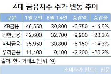 우리금융 손태승 회장과 하나금융 김정태 회장 등 임직원이 회사 주식을 잇달아 매입하고 KB금융과 신한금융이 자사주 소각에 나섰지만 4대 금융지주의 주가는 연초에 비해 10% 이상 하락한 상태다.