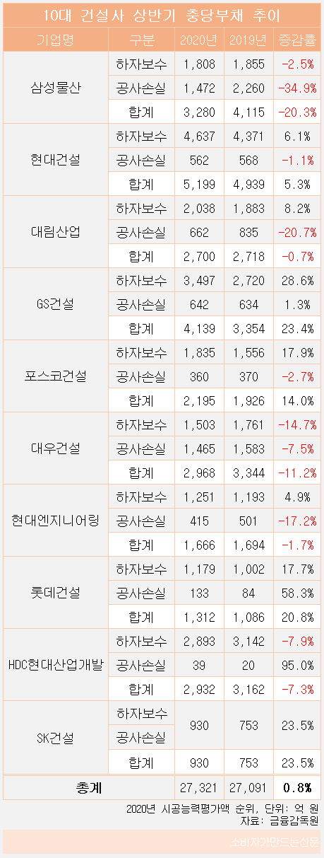 하자보수 충당부채는 2조1571억 원으로 6.6% 늘어났고 공사손실 충당부채는 6680억 원으로 12.2% 감소했다.