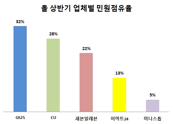 세븐일레븐 운영사 코리아세븐 편의점 사업 매출(4조205억 원)과 민원점유율(22%)도 비례했다.