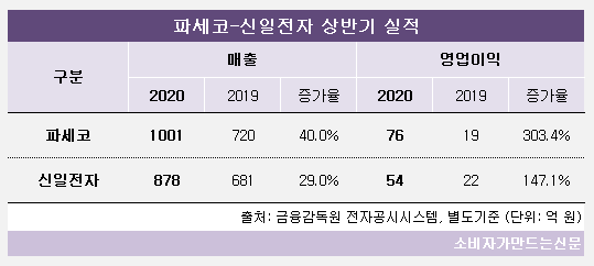 지난해 상반기에 파세코 매출이 720억 원으로 신일전자를 197억 원 많았으나, 올 상반기에 그 격차가 281억 원으로 벌어졌다. 신일전자 매출이 29% 늘었지만 파세코는 40%나 증가하며 우위를 굳혔다.