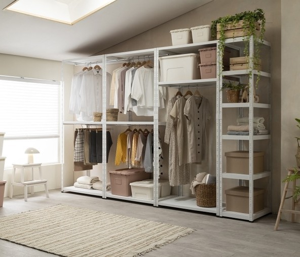 랙커스는 DIY(Do it yourself) 제품으로, 고객이 원하는 형태로 자유롭게 조합할 수 있는 것이 특징이다. 2~6단 선반장부터 드레스룸 행거장까지 총 76종의 형태로 연출할 수 있다.