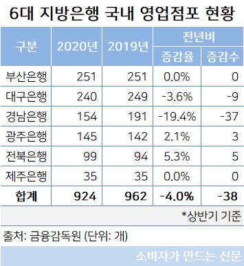 최근 공개된 반기보고서에 따르면 6개 지방은행의 국내 영업점포는 924개로 전년 대비 38개(4%) 감소했다.
