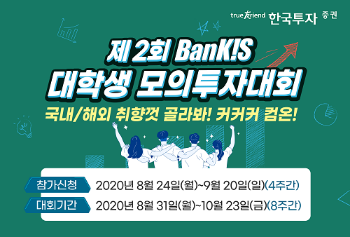 대학교 재학생과 휴학생 모두 참여할 수 있는 이번 모의투자 대회는 8월 31일부터 10월 23일까지 8주간 진행된다. 이번 대회부터는 해외주식 리그가 추가됐으며 국내주식 리그와 동시 참여가 가능하다. 참가 신청은 홈페이지와 온라인 거래시스템 ‘eFriend plus’, ‘한국투자’ 앱에서 다음달 20일까지 가능하다.