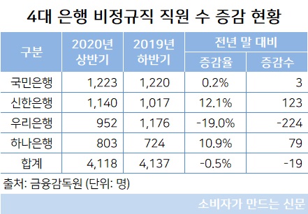 한 은행 관계자는 “명예퇴직 등으로 정규직이 감소했고 퇴직 지점장들의 재취업과 본점 전문인력 충원 등으로 비정규직이 증가했다”고 말했다.