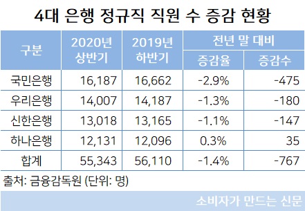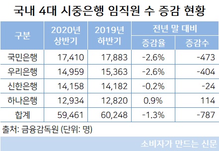 최근 공개된 은행 반기보고서에 따르면 상반기말 기준 4대 은행의 직원 수는 5만9461명으로 지난해 말 6만248명과 비교해 1.3%(787명) 줄었다. 4대 은행의 직원 수는 지난해 6월 이후 연말까지 점진적인 증가세를 보이고 있었다.