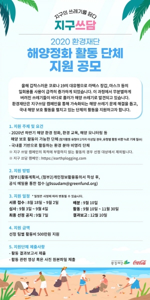 한국 코카-콜라는 환경재단과 손잡고 해양쓰레기의 심각성과 해양 보호 필요성을 알리고 국내 해양 환경 보호를 위해 ‘2020 지구쓰담 캠페인’을 진행한다고 27일 밝혔다.