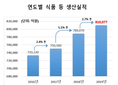 27일 식품의약품안전처(처장 이의경)는 ‘2019년 국내 식품산업 생산실적은 81조77억 원으로 전년(78조9070억 원) 보다 2.7% 증가했다고 밝혔다. 국내 제조업 총생산(GDP) 대비 16.7%, 국내 총생산(GDP) 대비 4.2%를 차지한다.