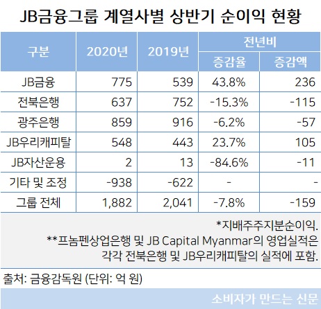 JB금융 관계자는 “코로나19 확산으로 경기가 둔화됐고 사상 초유의 저금리 상황 때문에 순이자마진(NIM)이 하락하는 등 경영환경이 악화되고 있는 여건 속에서도 그룹 계열사들의 양호한 실적은 이어졌다”면서 “여신전문금융사인 JB우리캐피탈도 548억 원의 순이익을 기록하는 등 은행과 비은행 자회사 모두 고르게 이익 성장세를 나타냈다”고 설명했다.
