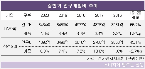 삼성SDI는 올해 상반기에 역대 최대 규모의 연구개발비를 지출했다. 지난해 상반기에 5000억 원 이상의 연구개발투자를 진행했던 LG화학은 올해 상반기에도 5000억 원대 투자를 유지했다.