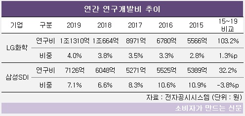 삼성SDI는 올해 연구개발비로 8000억 원가량을 사용할 것으로 알려졌다. 역대 최대 규모다. LG화학도 전년보다는 늘어난 금액을 투자한다는 방침이다.