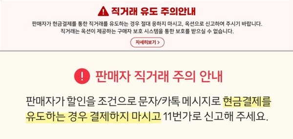 실제 11번가, 옥션, G마켓 등 오픈마켓들은 최근 사기 판매 유형이 많은 가전제품 검색 시 사이트 상단에 ‘직거래 유도 주의안내문’을 게시하고 있다.