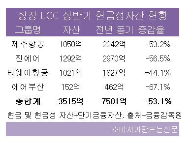 금융감독원 전자공시시스템에 따르면 상반기 상장 LCC 4곳이 보유한 현금성 자산(현금 및 현금성자산, 단기금융상품)은 약 3515억 원이다. 이는 전년 동기 7501억 원에 비해 53.1%나 감소한 수치다.