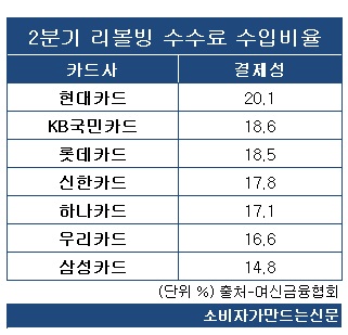 9일 여신금융협회 ‘분기별 수수료 등 수입비율’에 따르면 2분기 결제성 리볼빙 수입비율은 현대카드가 20.1%로 가장 높은 것으로 확인됐다.