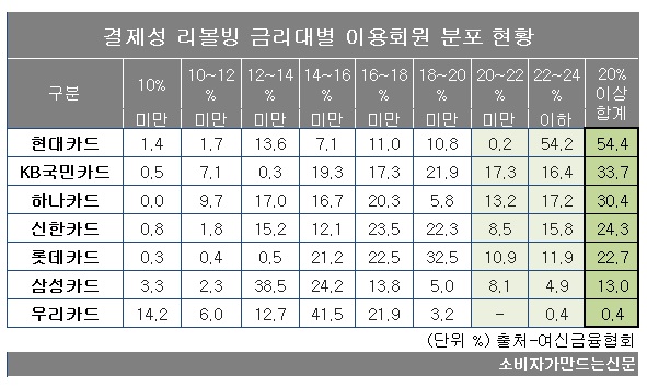 현대카드의 리볼빙 이용회원 절반 이상이 실제 고금리를 부담하고 있다. 지난달 31일 기준 현대카드의 리볼빙 이용 회원 중 20% 이상 고금리 납부 비율은 54.4%에 달한다. 다른 카드사 대비 월등히 높은 수치다.
