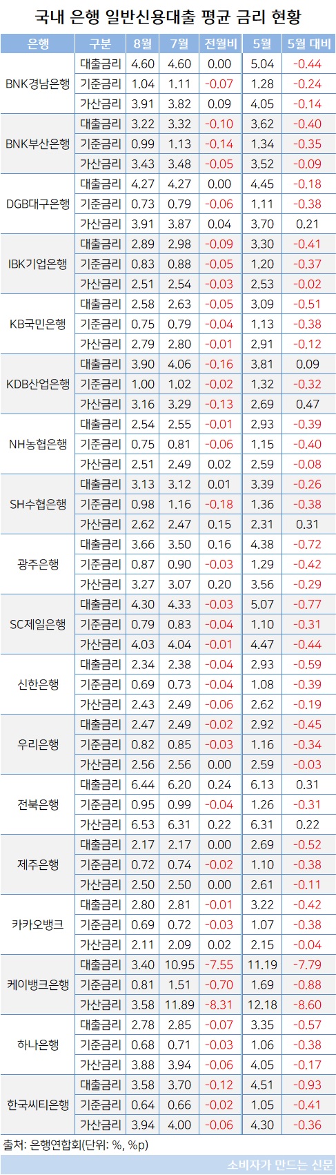 4일 은행연합회에 따르면 지난달 국내 은행의 일반신용대출 평균금리는 대체로 하락세를 보였다. 18개 은행 중 8월 기준 일반신용대출 평균금리가 전월(7월) 대비 하락한 곳은 12개에 달했다. 금리가 오른 곳은 수협은행, 광주은행, 전북은행 등 3개 은행에 그쳤다.