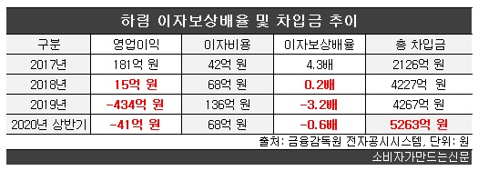 하림은 총 차입금이 지속적으로 증가하는 가운데 영업적자가 지속되면서 정상적인 경영활동을 통해 이자도 벌지 못하는 상태에 빠져 있다.