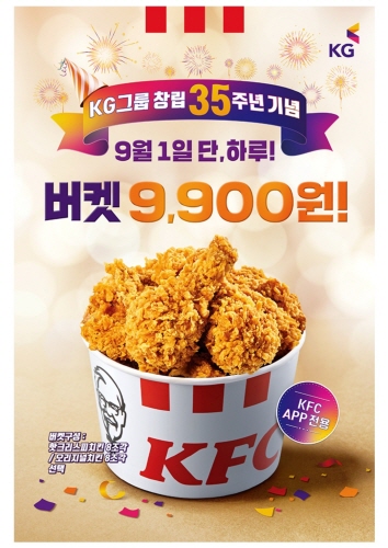 KFC는 모기업인 KG그룹 창립 35주년을 기념해 9월1일 단 하루 핫크리스피 또는 오리지널 버켓을 9900원에 제공하는 이벤트를 열었다.