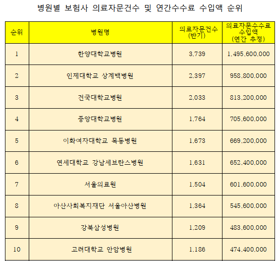 의료자문 건수가 가장 많은 병원은 한양대학교병원으로 연간 7500여 건이 넘는 소견서를 발급하며 15억 원의 자문료를 받은 것으로 나타났다. 2위는 인제대 상계백병원, 3위는 건국대학교 병원이었다.