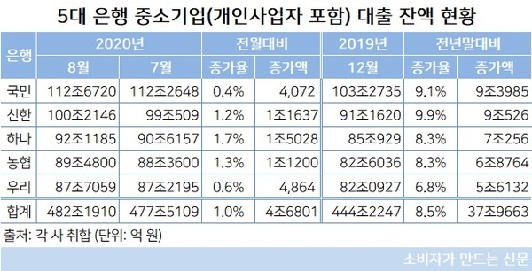 5대 은행의 계수자료를 취합한 결과 지난 8월 말 중소기업 대출 잔액은 482조1910억 원으로 올 들어 37조9663억 원, 8.5% 증가했다. 전달인 7월과 비교해도 약 5조원에 달하는 증가액을 기록했다.