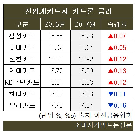 7월 말 표준등급 기준 카드론 평균금리는 14.6~16.7% 사이로 확인된다. 삼성카드가 16.73%로 전 월 대비 0.07%p 상승하며 가장 높은 수치를 기록했고 롯데카드가 16.07%(0.05%p), 신한카드가 15.92%(0.12%p)로 뒤를 이었다. 현대카드와 KB국민카드도 각각 15.9%, 15.33%로 전월 보다 0.13%p, 0.12%p 올랐다.