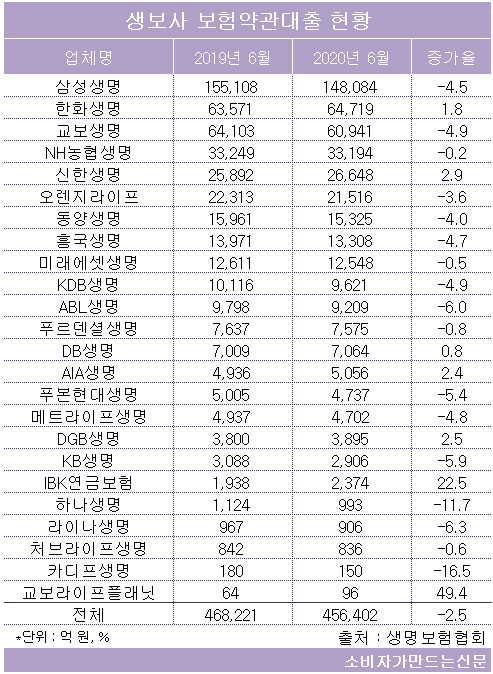 보험약관대출이 가장 늘어난 곳은 교보라이프플래닛생명으로 64억 원에서 96억 원으로 50% 가까이 늘었다. IBK연금보험(22.5%), 신한생명(2.9%), DGB생명(2.5%), AIA생명(2.4%), 한화생명(1.8%), DB생명(0.8%) 등 7곳이 증가했다.