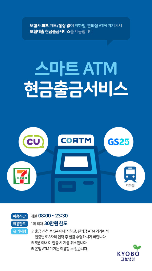 ‘보험계약대출 스마트출금 서비스’란 실물카드 없이도 편의점이나 지하철 현금자동입출금기(ATM)에서 보험계약대출로 현금을 출금할 수 있는 서비스다.