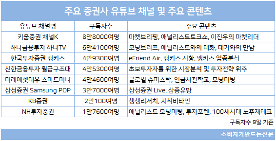 이 외에도 한국투자증권 뱅키스(4.92만 명), 신한금융투자 월급구조대(4.36만명), KB증권(2.01만 명), NH투자증권(1.76만 명) 등이 구독자수 1만 명 이상을 확보한 상태다. 이 중에서 신한금융투자 월급구조대는 종목 분석 위주의 타사와 달리 주식을 처음 시작하는 초보투자자, 젊은 투자자들을 공략하기 위한 기초 콘텐츠로 구성돼있어 호평을 받고 있다.