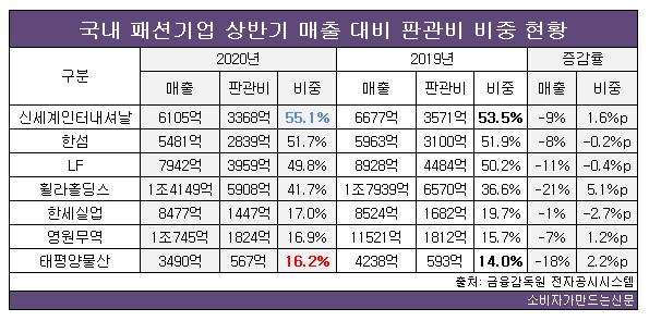 판관비 비중이 가장 높은 신세계인터내셔날은 코로나19사태에 따른 실적부진에도 불구하고 고용유지와 인재영입 등에 따른 인건비 증가로 매출대비 판관비 비중이 높다는 입장을 밝혔다.