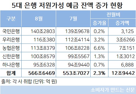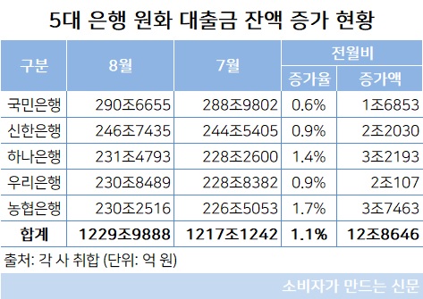 5대 은행의 지난달 말 원화대출금 총 잔액은 1229조9888억 원으로 7월 대비 1.1%(12조8646억 원) 늘었다. 저원가성 예금 역시 2.3%(12조9442억 원) 증가한 566조6469억 원을 기록했다.