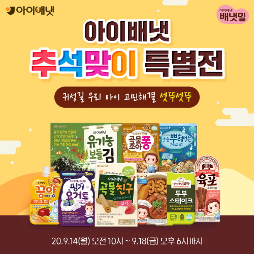 아이배냇 관계자는 “추석 연휴 아이들의 먹거리로 고민하실 엄마들에게 도움을 드리고자 이번 특별전을 준비했다”며 “아이배냇의 건강하고 맛있는 제품들과 함께 아이들이 건강하고 행복한 추석 명절을 보내길 바란다”고 말했다.