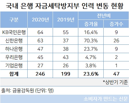 반기보고서에 따르면 KB국민은행과 신한은행, 하나은행, 우리은행, IBK기업은행 등 주요 은행의 자금세탁방지 전담 인력은 올 상반기말 기준 246명으로 전년 동기 199명에 비해 47명, 비율로는 23.6% 증가했다.